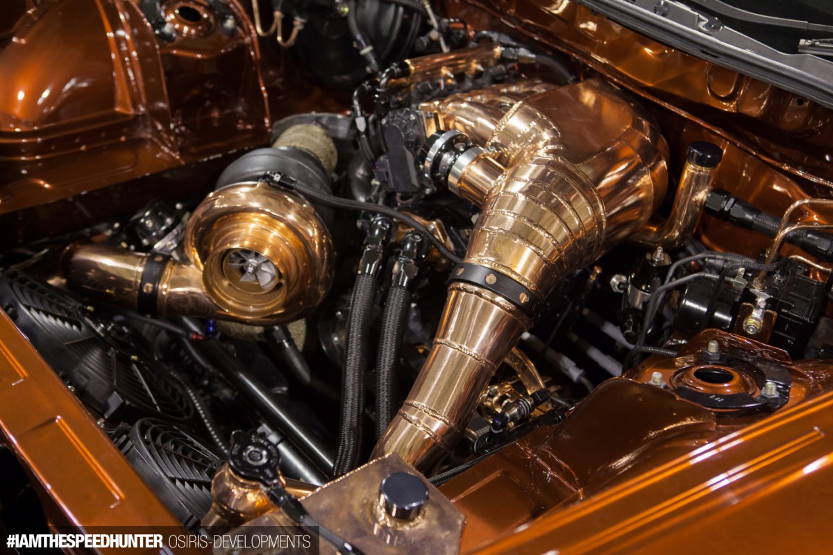 The most unique feature however, has to be Leon’s generous use of copper plating, which he tells us was extremely time consuming and is ridiculously hard to keep clean! This plating is actually part of the chroming process – it’s the second to last step before nickel and the final chrome coats are applied. Once the copper plating takes place, the parts all have to be hand polished to perfection before the final clear-coat is applied so that the finish doesn’t tarnish. The custom plenum feeds into three individual 55mm throttle bodies running E-throttle, and then into a custom intake manifold. Leon mocked up some of these parts three or four times, purely to get them looking the exact way he wanted! We love the way the Tangerine Candy paint (a House Of Kolor hue) frames everything and ties it together as one glimmering orange masterpiece.