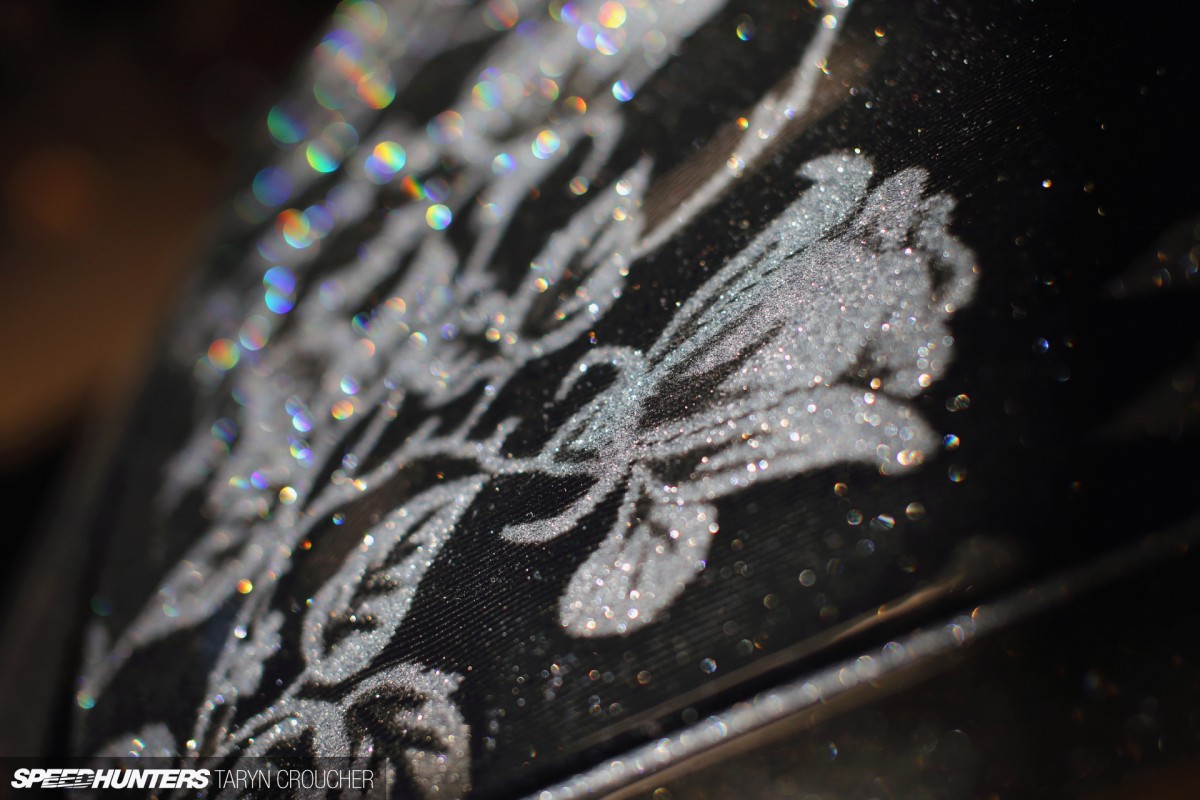 The coolest thing about Jimmi’s car is that is made him rediscover his passion for having a project, and he soon started to pour all of his energy and creative ideas into his 200SX. Old school American customs, Japanese bippu-style and creative motorcycle builds have played a part in influencing his styling choices, with one of the main features being the custom-painted lace-print roof with metal-flake, pinstriped side pillars.