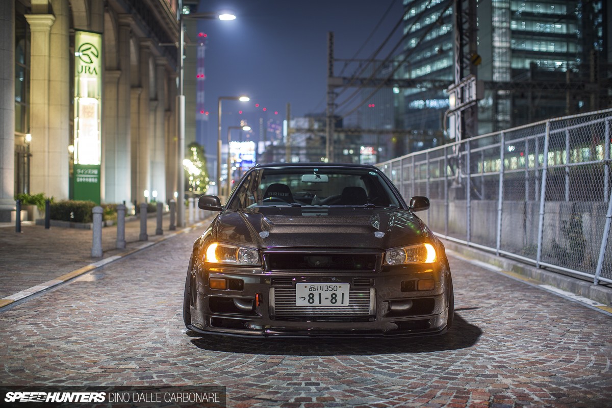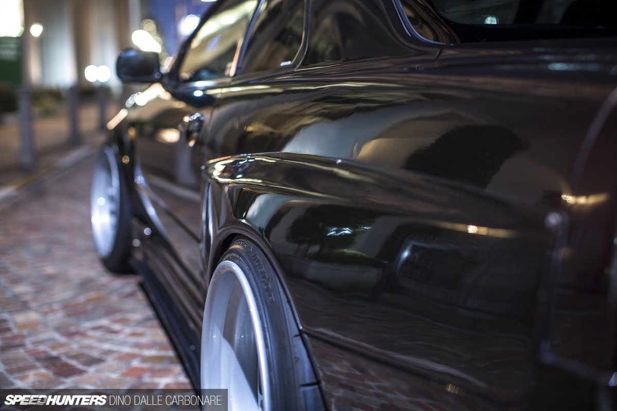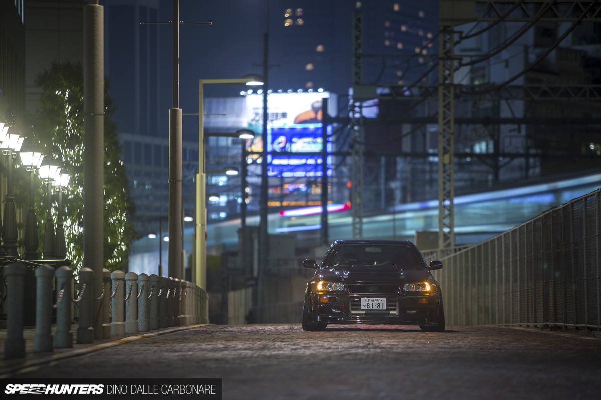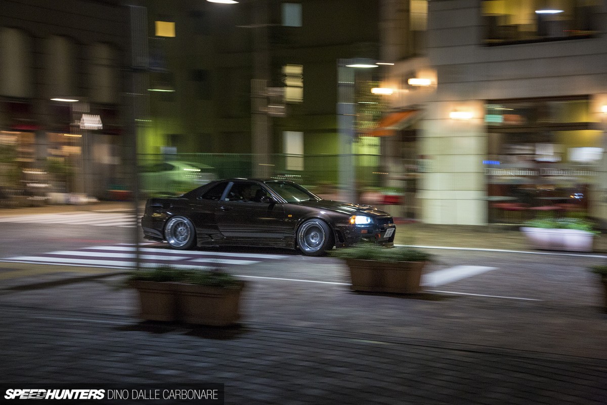 I was instantly happy, as the few images I had seen of Takashi’s Skyline online in no way represented how damn cool it looked in person. Sitting down on the cold cobble stones setting up my tripod, the ER34 just popped against the background I had chosen, the street lights playing around with deep Porsche Macadamia Metallic hue.