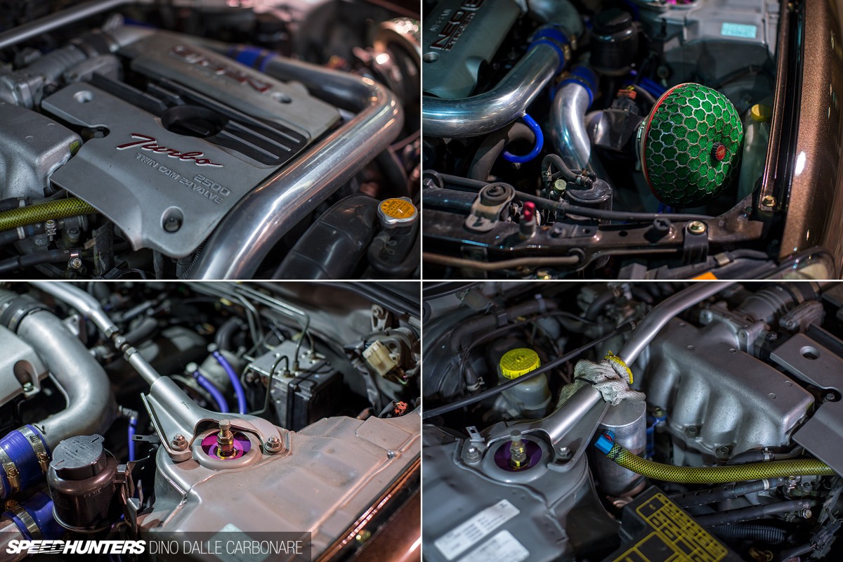 The sum of all the styling modifications is impressive, but looks aren’t much without an adequate amount of power to back them up. Seeing that Takashi drifts the ER34 regularly, a few select upgrades were required.