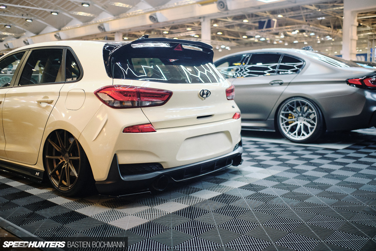Outside this hall, Essen is packed with industry names displaying their latest builds and products. One thing I noticed in 2021 was a few more wheel manufacturers than before, and it seems the German aftermarket industry is embracing a more varied choice of cars too. Around every corner was some kind of modified Hyundai, and this bagged i30N on the Wheelforce booth was an example of one done right.