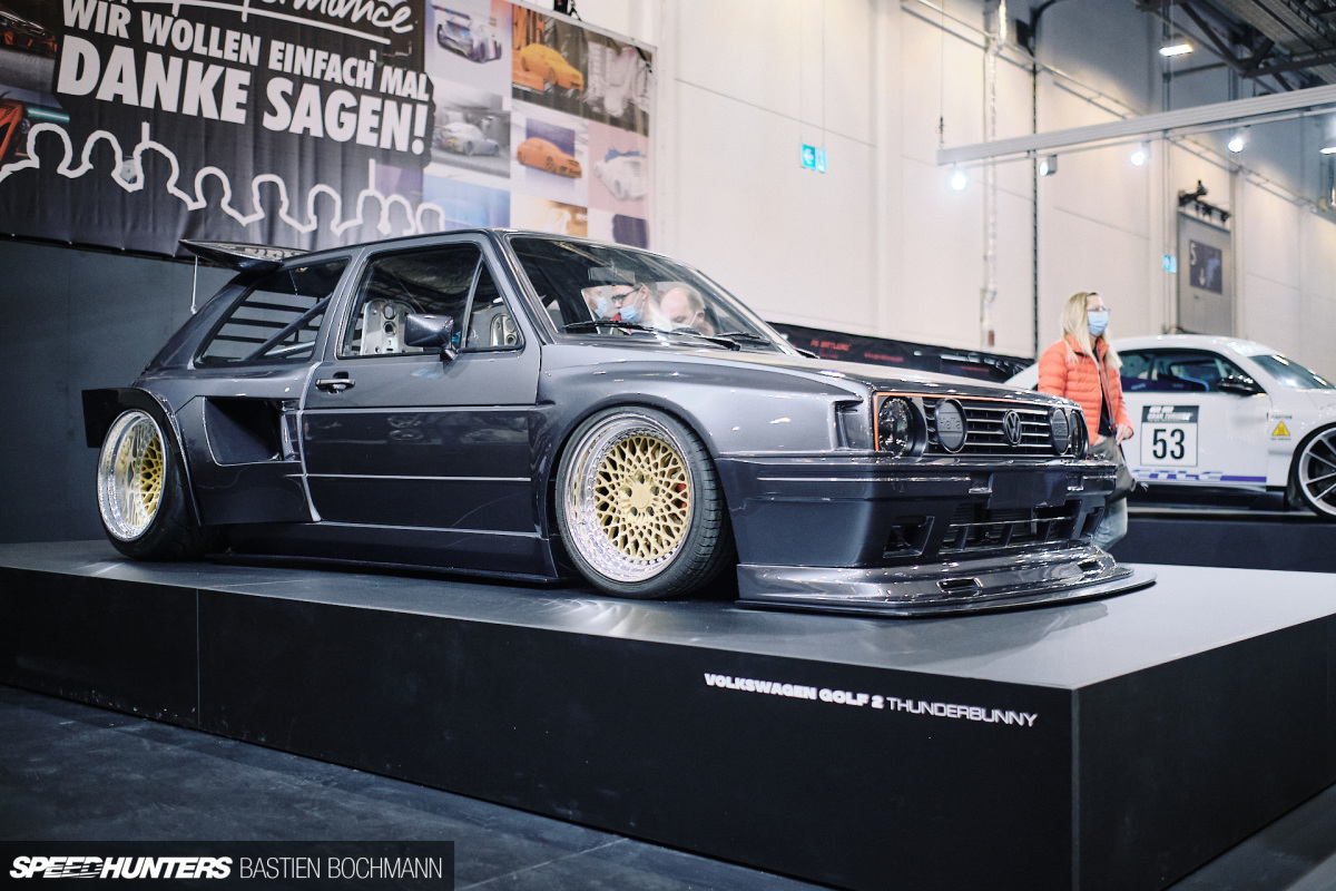 German tuner and YouTuber Jean Pierre Kraemer of JP Performance displayed several of his cars, amongst them the now well-known ‘Thunderbunny’ Mk2 Golf which broke the internet a short while back. Other highlights included a VW Beetle concept car recreation and a colourful, bagged A90 Toyota Supra.