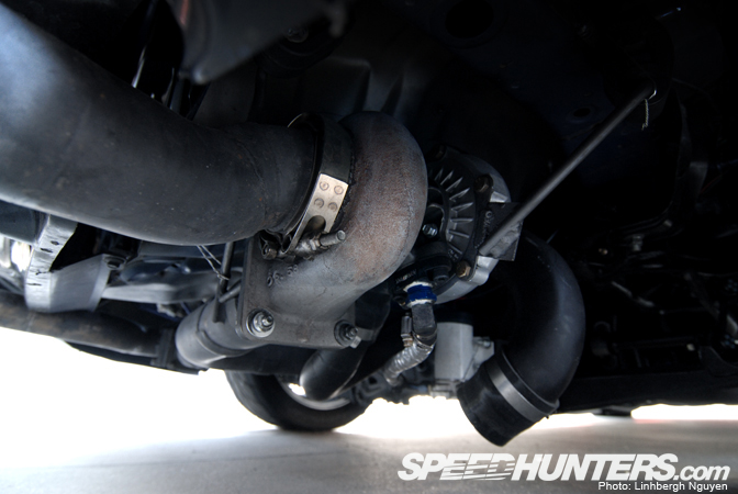 …and see this! This is a rear mounted Turbonetics T3 turbine.