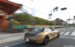 …a customer car that had been dressed in a full Gold Rush vinyl wrap that was done for this year’s Auto Salon. Shikata-san, the man behind S & Co has an impressive workshop where all sorts of restoration and custom magic happens to a variation of vintage as well as modern cars, but one side of his business is creating custom vinyl wraps for all sorts of applications. Seeing that the fourth Gold Rush race kicks off tomorrow in LA I thought this would be a perfect time to take a look at this stunning SLS. In reality it was all just an intricate excuse to play around with what is still a pretty rare car in Japan. Honestly, do you blame me?