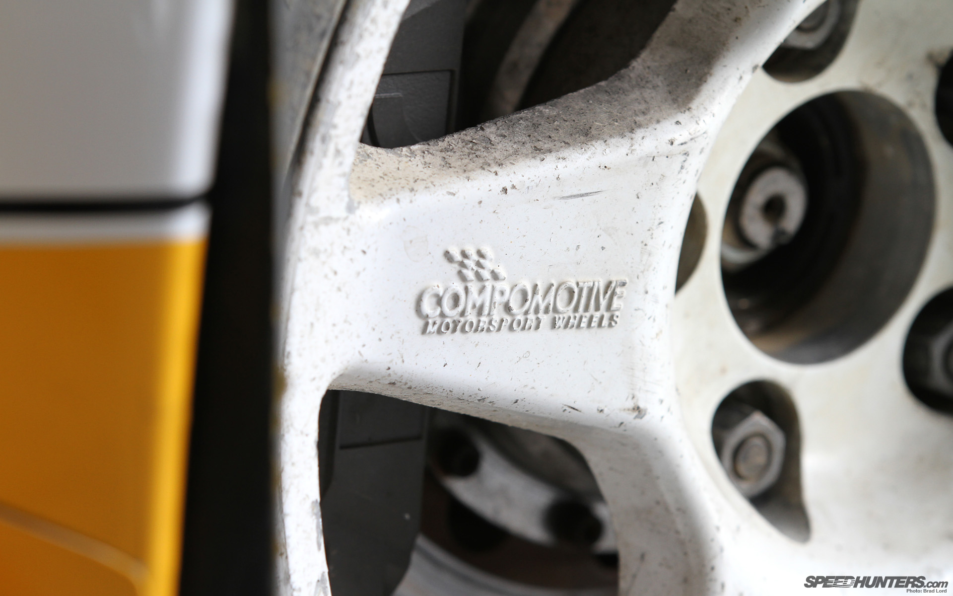 Wheels/Tires: 15×7″ Compomotive Motorsport wheels; MRF ZG2 205/65R15 rally tires (gravel); 18×10″ Compomotive Motorsport wheels (tarmac)