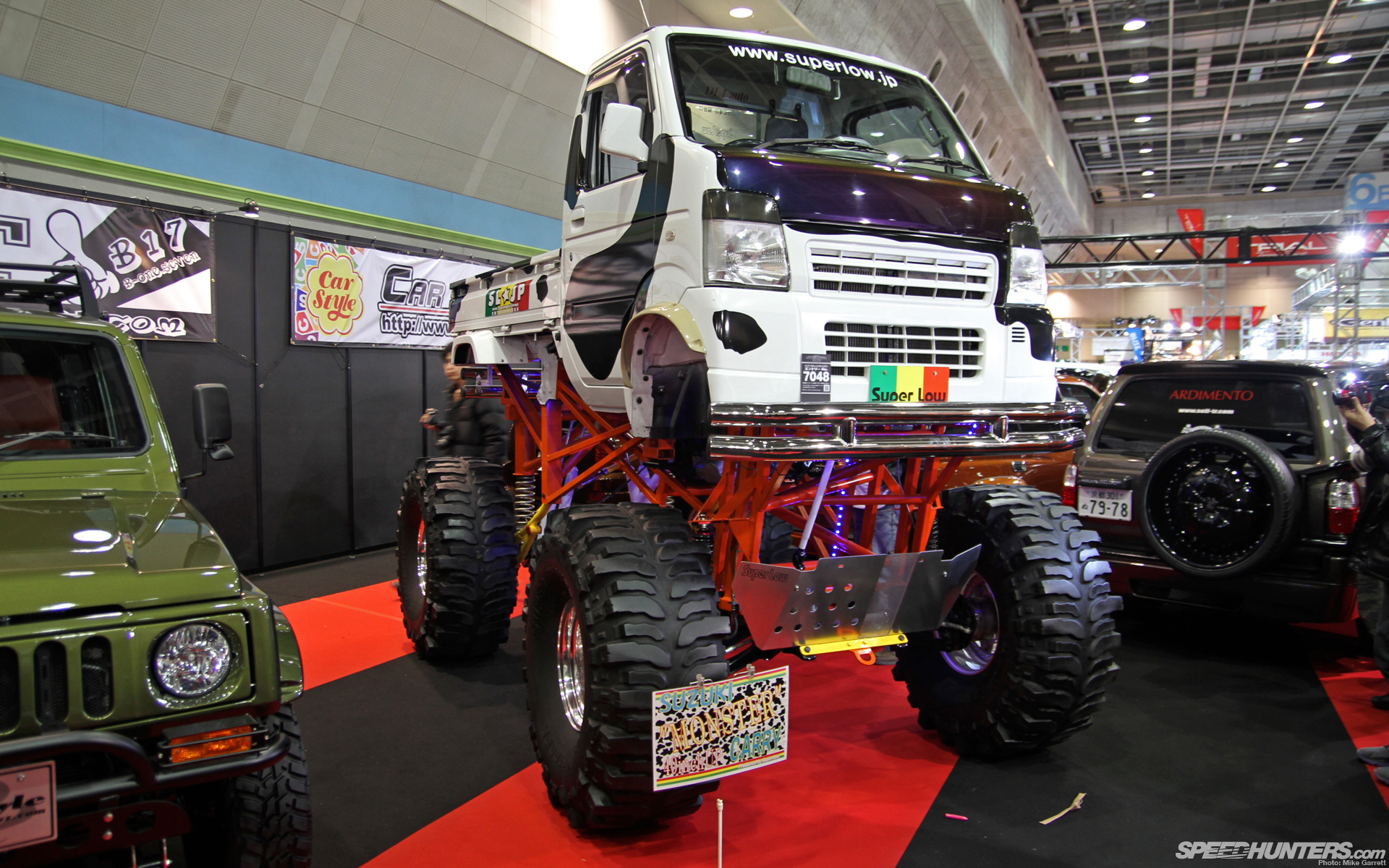 Since “crazy” is the most appropriate word I’d use to describe Auto Messe, let’s begin with the one of the craziest vehicles on the show floor – the “Monster Carry” from the ironically named Super Low custom shop from Nara Prefecture.