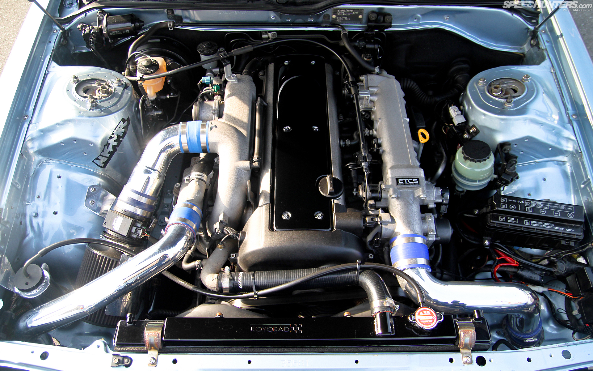 Another big part of the transformation took place under the hood. Those familiar with the US market Cressida know that the only powertrain option was the smooth but boring 7M-GE and four-speed automatic transmission. Fortunately, Hasshy’s plans didn’t include swapping a 7M and auto into his Mark II. Instead, he pulled out the car’s original 125 horsepower 1G-FE and replaced it with a VVT-i 1JZ-GTE from a JZX100. He also swapped out the original automatic trans for an R154 five-speed.