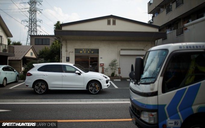 The truth of the matter was, up until that first day I hadn’t really found anything to make me really hate the Cayenne. In fact, it continued to lure me in, trying to charm me away from that opinion I have about these type of vehicles. With the crazy Japanese summer heat taking a toll on our shooting stamina, Larry was very happy to discover the door pockets were designed to accommodate a 7-Eleven 2-liter water bottle!