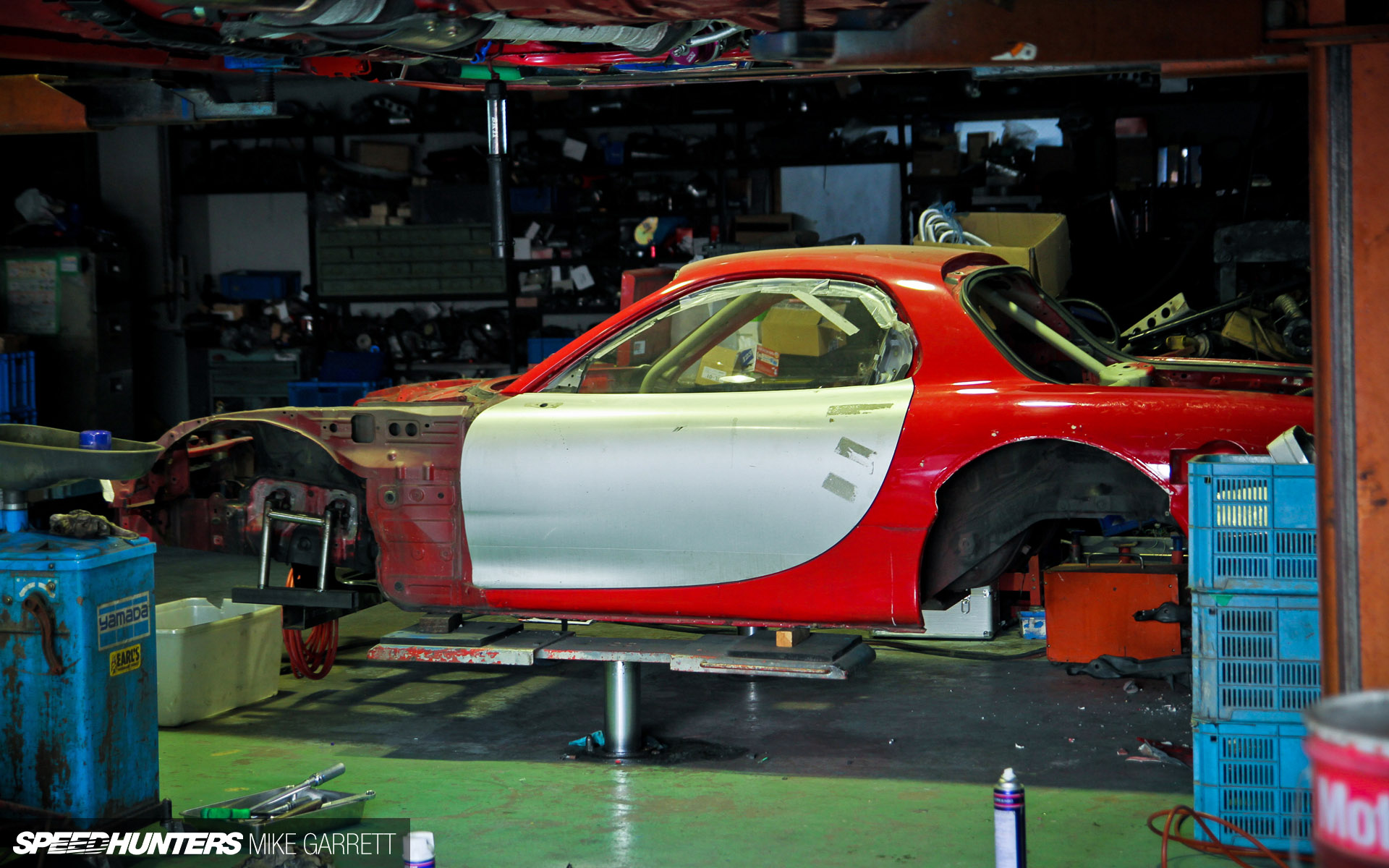 On the particular afternoon we visited, there were a pair of FD3S RX-7s in the shop. One was a complete Greddy Super 7 with its distinct Porsche front end…