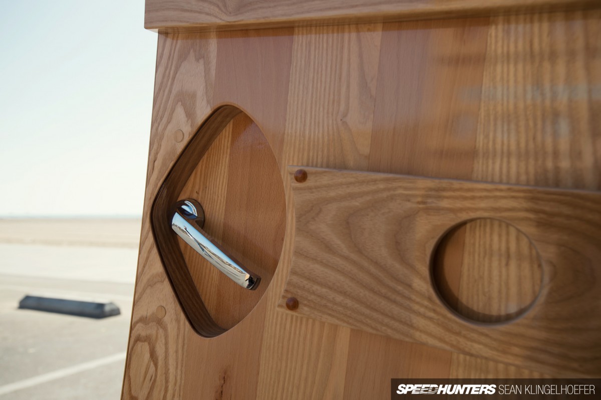 The wood panels are also great for hiding things like air conditioning and compressors for the suspension. Tim Conder formed this custom sheetmetal dog-house to hide the engine before painting it to match the exterior.