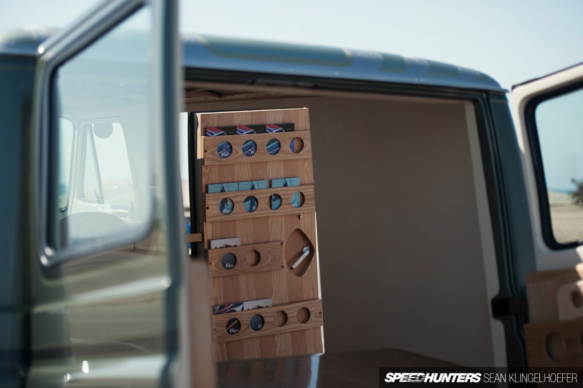 To say that Coby is talented in the graphics department is an understatement. He has an aesthetic gift most don’t even come close to, and it shows in everything he does – including this 1963 Ford Econoline. As you can see here, his van was built for a purpose: to haul around his swag so he can sell it at car shows. This sliding drawer holds limited edition prints, and it’s just the tip of the iceberg. We’ll come back to the interior later though.