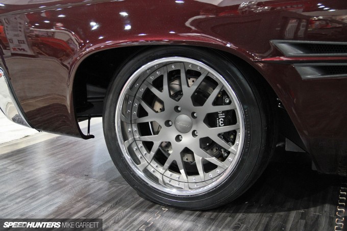 The retro-styled wheels are a one-off design from the car’s builder, and you can see the Baer six-pot brakes peeking out from behind the spokes.