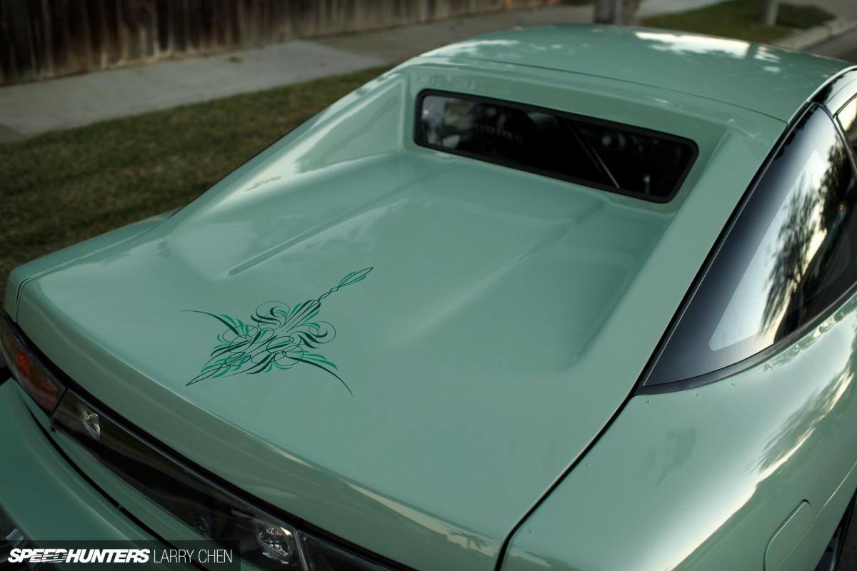 This car is very stylish and I like the unique color but it is still an S13 with mostly typical bolt-on stuff. The pinstriping is very cool, but the louvered panels riveted onto the hood look cheezy. I get that it's a nod to Kustom style, but Kustom is defined by a high level of finish while these look very unfinished, so I think they miss the mark in that respect. The hatch is "unique" as in most people don't go for it but it is still just a bolt-on affair and not "Kustom" either. Really the only Kustom aspect is the pinstriping which looks awesome. Drifting is no excuse for ziptie'd saggy body parts. Hopefully the owner is pleased, whatever he does with this vehicle.