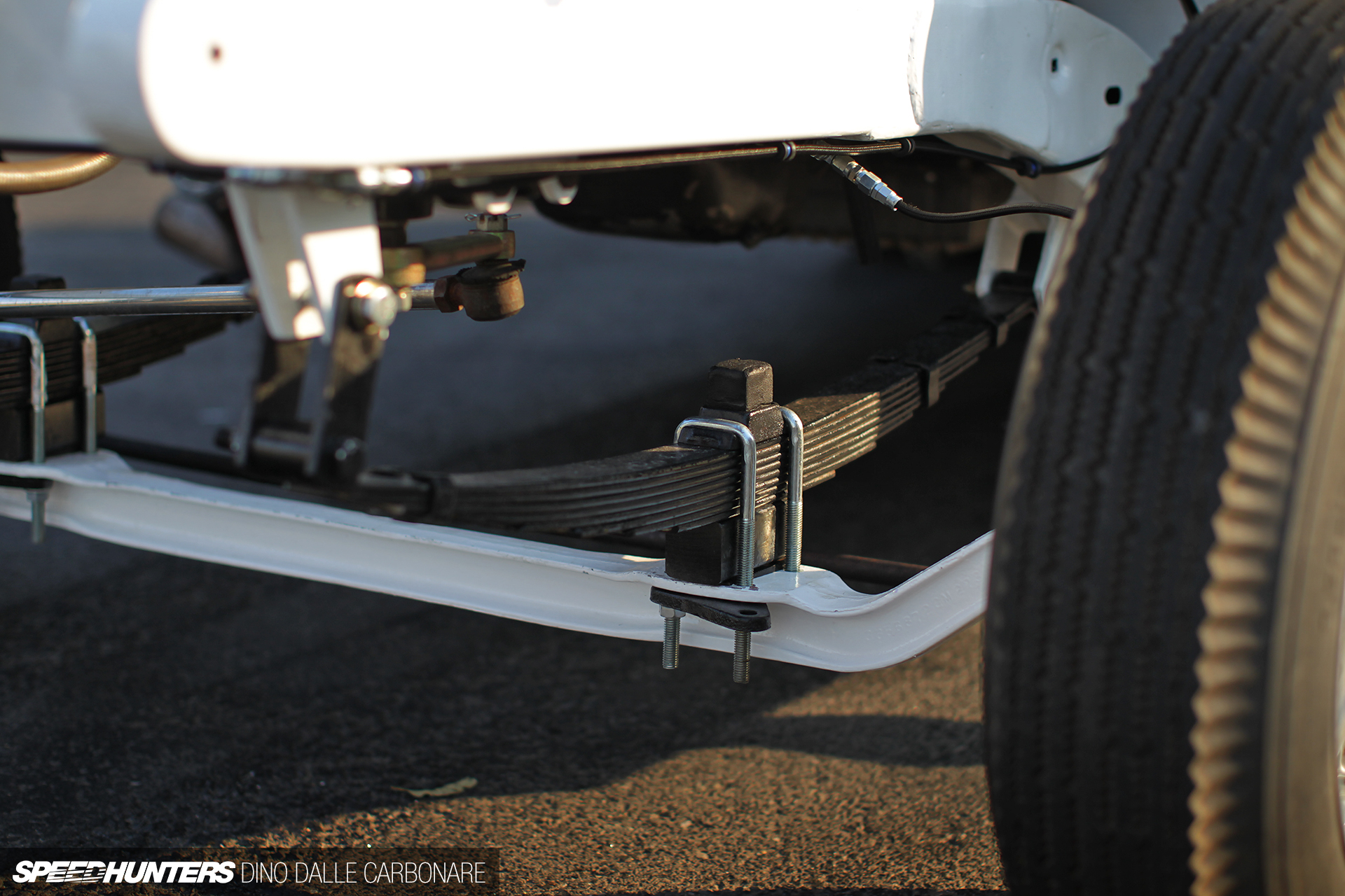 Chrome SoCal shocks, ’50 Chevy front leaf springs with solid axle, Spax rear coilovers, Competition Engineering steering column, Vega steering box, CPP and Wilwood brakes