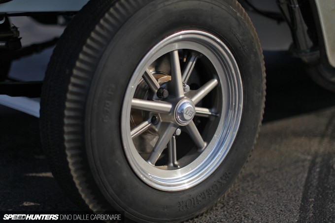 Crucial to any gasser is the big and little tire combo. The ’55 wears skinny bias ply front runners on 15×6 E/T ten spokes.
