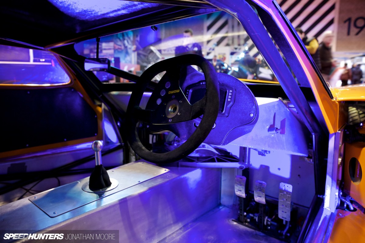 The interior’s a focused place to be, with the FIA-approved roll cage extending right through the dash. Power is sent to the rear wheels through a converted six-speed automatic transaxle, with a manual paddle shift. But what’s pushing it all along? Well, there’s the really trick bit…