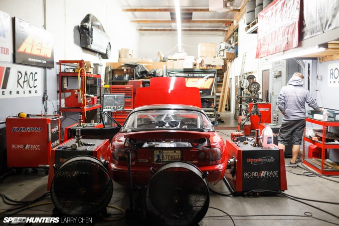He’s had this Mazda Miata since 2007, which he bought for $900. He sourced the motor from a former Formula Drift car run by Jeff Abbott.