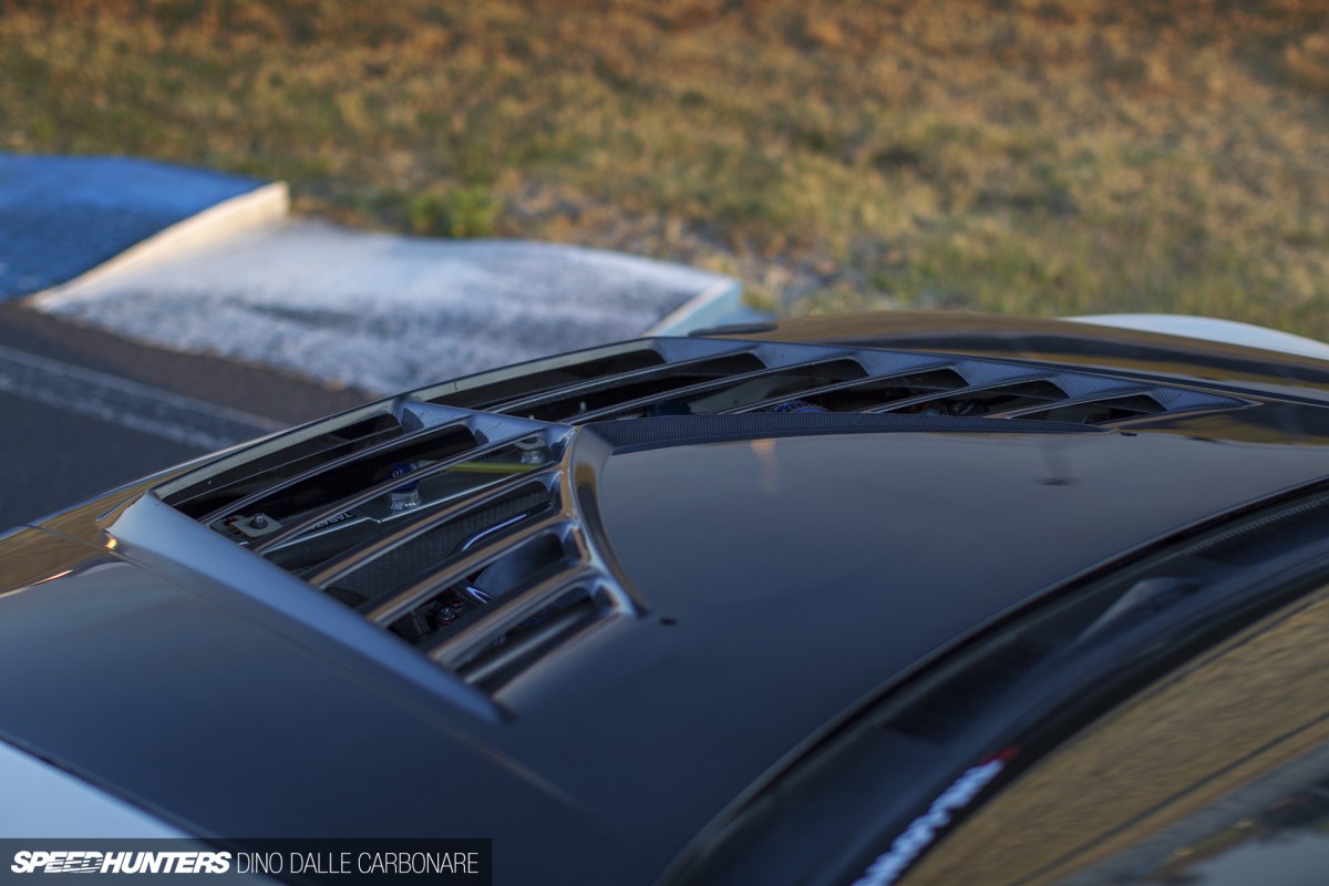 Dumping air quickly and efficiently from inside the engine bay is just as important as scooping it up in the first place and this is facilitated via the large V-shaped louvered openings on the First Molding carbon bonnet.