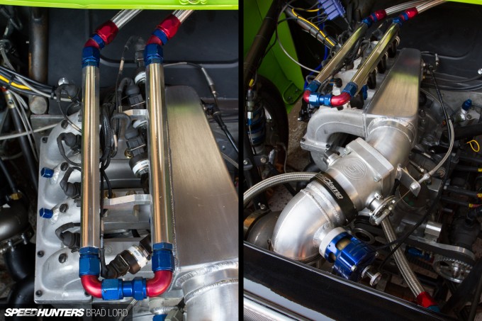 Running on cool-burning methanol has negated the need for any form of intercooling, but there’s a custom oil cooler set-up, and a RotorMaster radiator with a Dedenbear water pump to circulate coolant and keep temps in check. Despite only being run for short periods at a time, things get hot really quick.