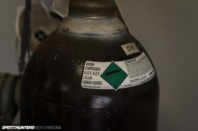 This is MIG welding, MIG standing for Metal Inert Gas. The gas is used to shield the molten puddle from the atmosphere and provide a clean environment for your weld. CO2 is the cheaper way to go, but I learned long ago that C25, which is 25% Argon and 75% Carbon Dioxide, produces a cleaner weld. I also recommend getting the biggest bottle you can, because the refills don’t cost much more but last up to five times longer than the little bottles.
