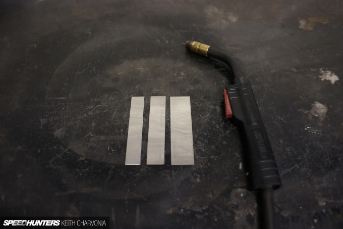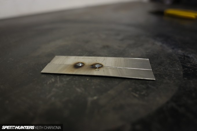 To show Joe the ropes, I first cut some small pieces of sheetmetal, called coupons in the welding world. It’s always a good idea to set your welder using the same material you’ll be working with, unless you’ve done a ton of welding on the exact same type of metal and already know which setting to use.