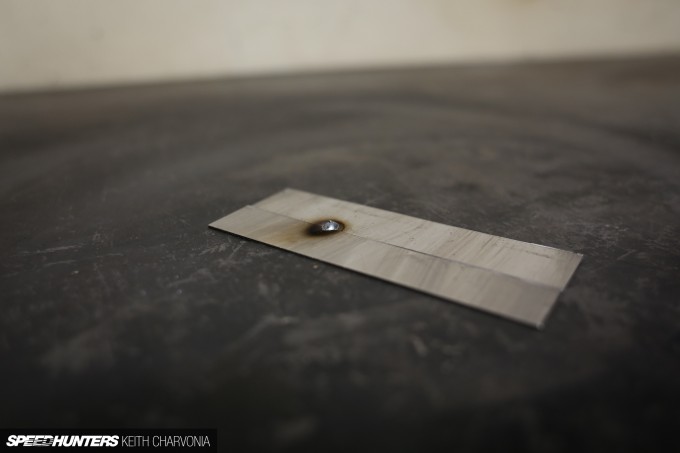 The second tack is what I would call ideal. It penetrated the metal nicely, and left a flat weld so there’s less metal to grind off later. This counts when you weld up an entire car and then have to grind it smooth.