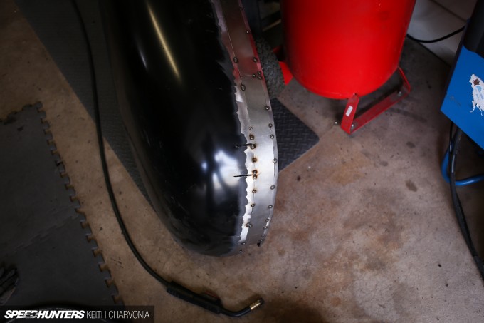 We worked our way around the fender, clamping it flush and adding a weld every few inches.