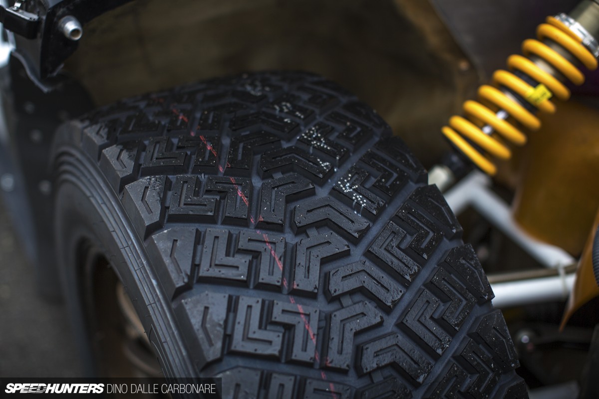 Here is a closer look at the Giti gravel rubber that Tajima had made for the Super 86. These measure 310/800-18 at each corner and are apparently impressive at digging down and finding grip on even the loosest and slipperiest type of surfaces.