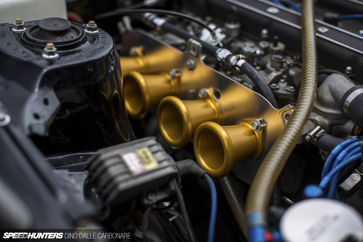 The work began with a conversion to 2000GT Celica-spec, which included an 18R-G motor and W50 transmission. This is an engine that could be considered the four-cylinder version of the straight-six 3M motor that powered the legendary 2000GT, and because of that fact Brian really wanted to maximise its potential. This called for the use of a Toyota Racing Development (TRD) Group 2 cylinder head to boost flow and response. The engine breathes through 40mm factory-spec Solex carburettors fitted with Techno Toy Tuning velocity stacks. Anodised gold, they’re pretty much the fist thing you notice when opening up the front-hinged bonnet.