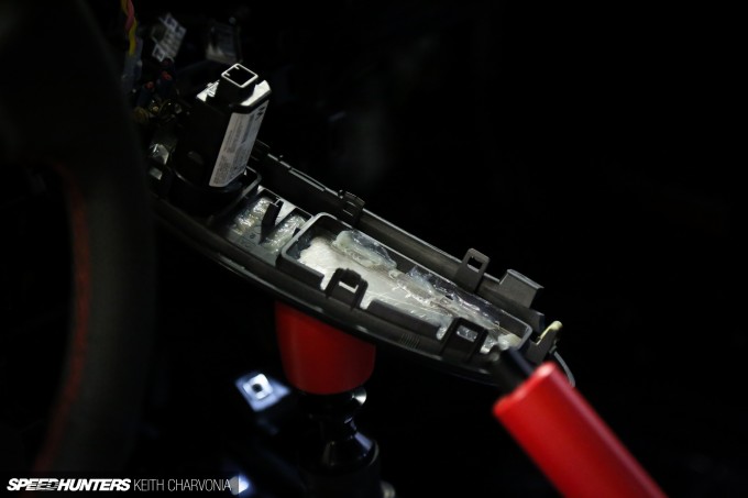 As I turned my attention to the interior I started noticing all the decidedly modern details. Airbag markings have no place on a vintage-themed race car, so we filled every last one of them.