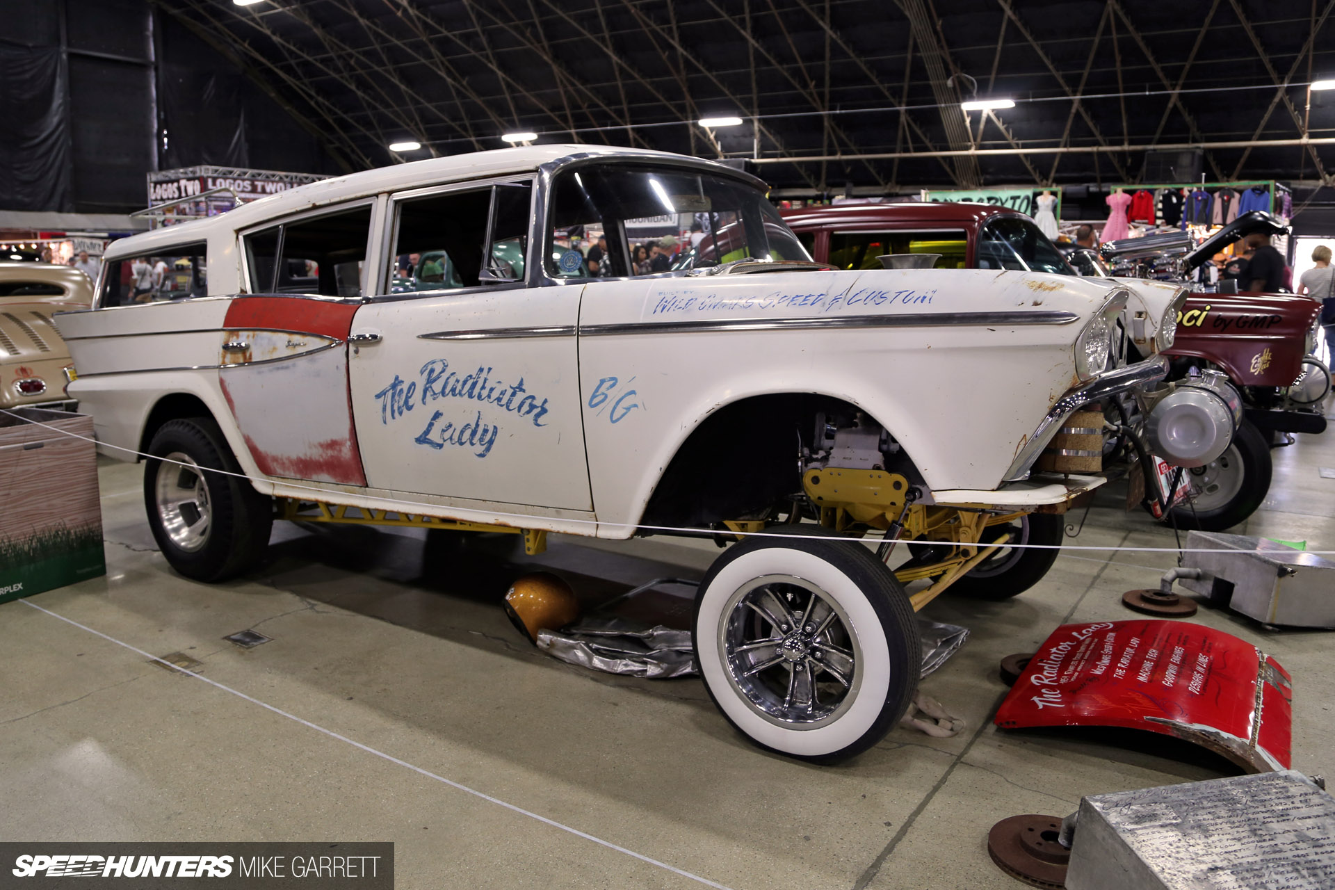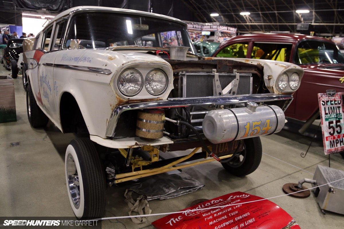 What do you get when you take an old station wagon from a long-vanished American brand and drop in a motor from another fallen manufacturer and then add a ton of retro-inspired drag style? You get The Radiator Lady – a 1959 Rambler Cross Country Wagon that I spotted at the Grand National Roadster Show in Pomona last month.