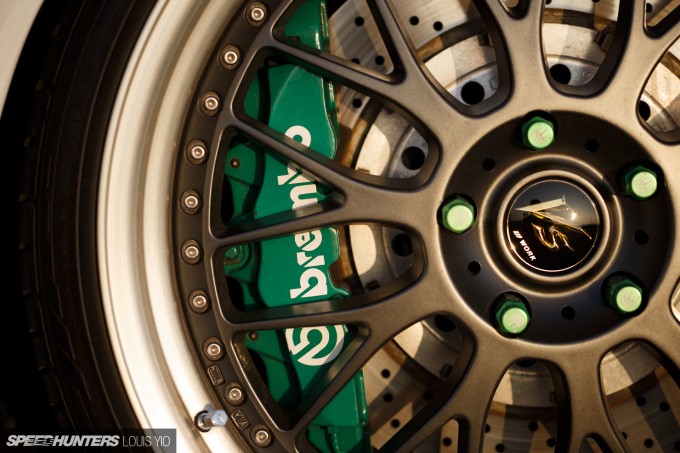 I was originally torn over the green calipers and lug nuts since they didn't fit anything else, but they're kind of like the Takata harnesses inside the car: a splash of color to break up the otherwise standard color scheme.