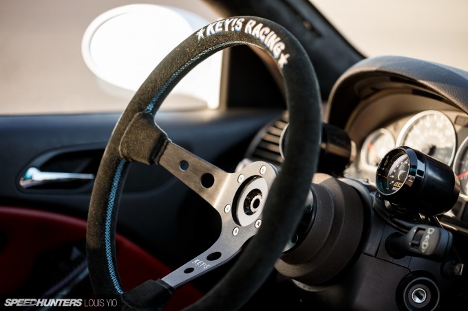 Let’s not forget the steering wheel either – a Key!s Racing deep cone mounted on a Momo hub with a 9K Racing quick release. You can also spot the AEM boost and air/fuel ratio gauges mounted on both sides of the steering column.