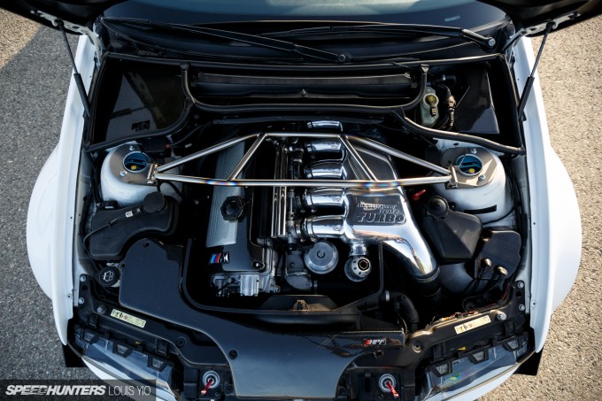 With its extremely aggressive bodywork, you can be assured that Pat would give equal intention to the M3’s engine bay. As mentioned a moment ago, the car formerly had a supercharger setup, but he’s since switched to a turbo kit with a fully built motor and all the supporting modifications.