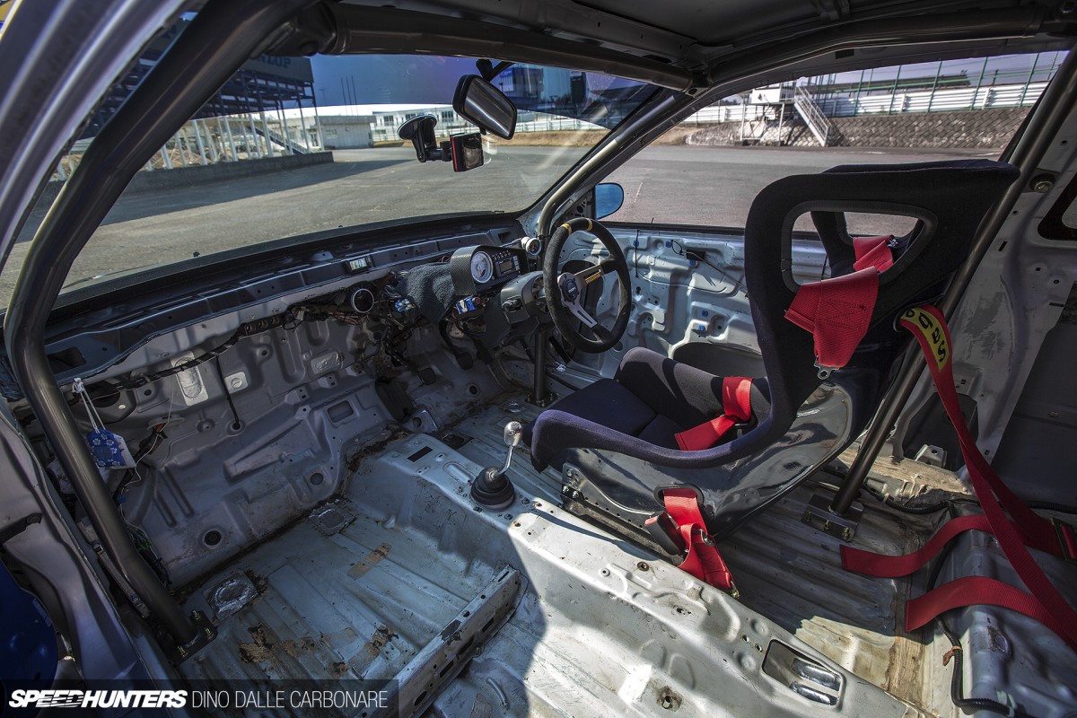 There is absolutely nothing left from the stock interior – just the plastic trim on the steering column, and the pedals. I’m sure the 6-point Saito Rollcage bolt-in cage will have most of our safety-conscious readers cringing, but it has helped stiffen the chassis up a little and will definitely add extra protection in the case of an impact. This, after all, is how things have always been done in Japan when it comes to cages.