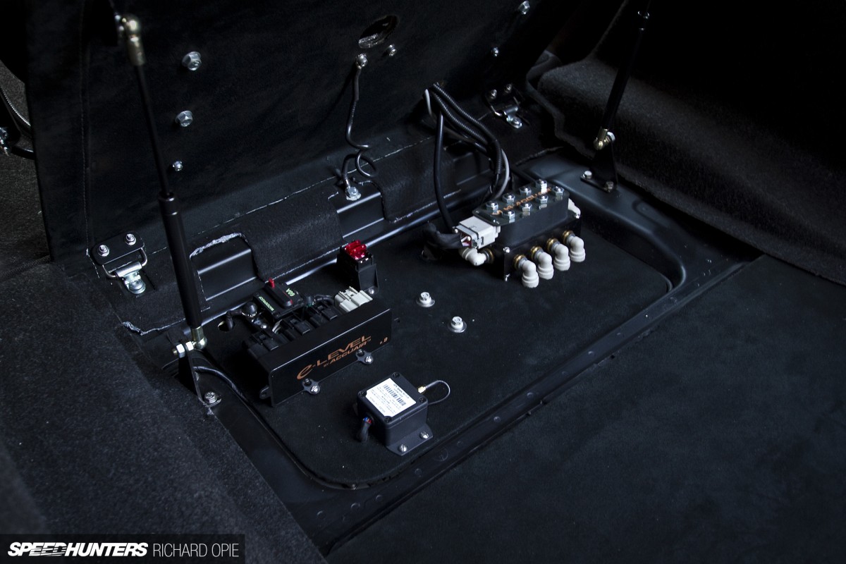 Neatly upholstered in Alcantara by good friend and accomplished auto-trimmer Greg, the mounting plate hinges forwards on a pair of gas struts to reveal the brains of the system. Tyler worked alongside his father Colin to create a cohesive install; the e-Level hardware and valve block all nestle neatly beneath the tank and compressor setup out of harms way, with the added bonus of maximising cargo space. You know, for practicality and all that…