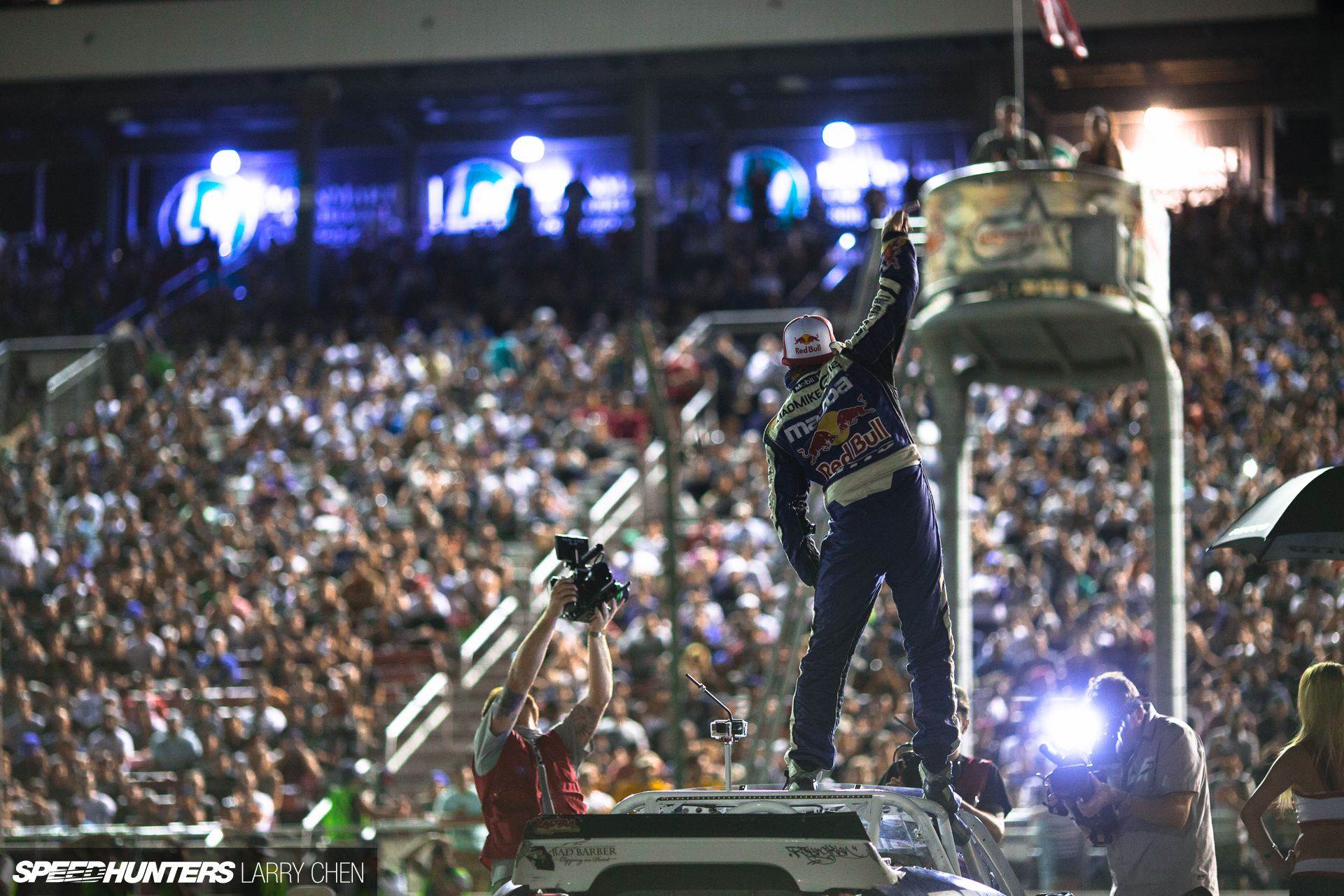 Sometimes the non-drifting photos are my favorites from an event, and this one is no exception. Of course, to me the best part is the story. That is actually Chris Forsberg riding to the podium in Ken Gushi’s car, because of course Chris’ car would not start after the Formula Drift staff told him to pull his fire suppression system.