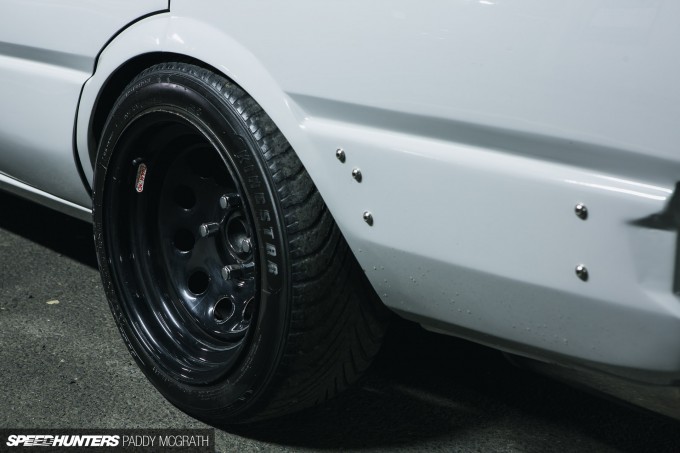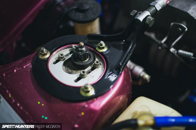 The sparkling pink paint in the engine bay was a deliberate choice; something to reinforce the idea of this Charmant being dull on the outside but quite the opposite underneath.