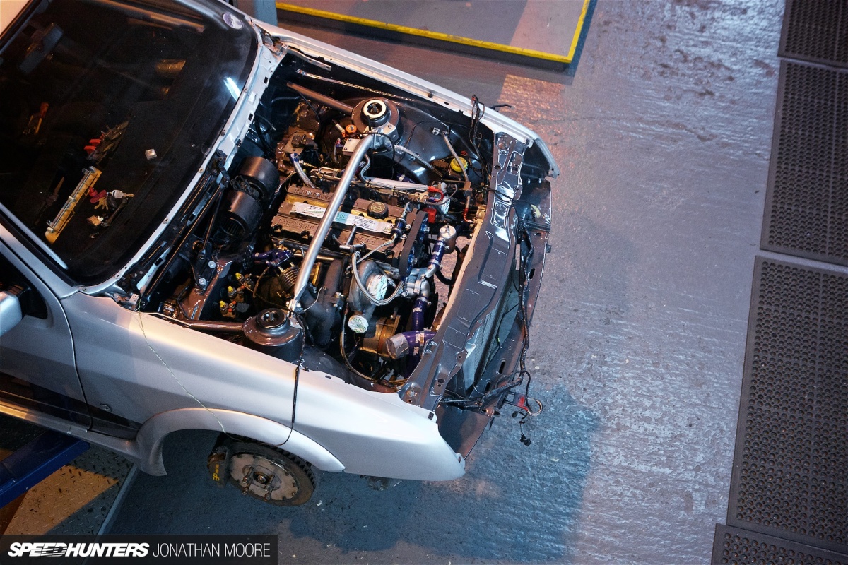 This extreme hillclimb RS200 had been slightly tucked around a corner when I first walked into the workshop, so it was a bit of a shock to stumble across its opened rear. This wasn’t any old RS200, but the iconic Mach 2 Pikes Peak RS200 driven by rallycross legend Mark Rennison; the car that was the first British machine to go sub 10 minutes.