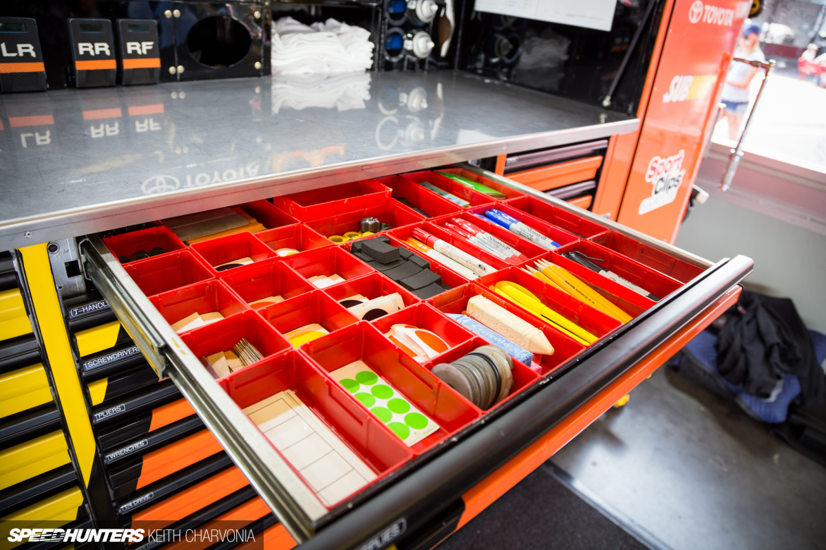Really though, the mechanics have every bit of hardware for the race car neatly sorted into bins, ready to be put into action.