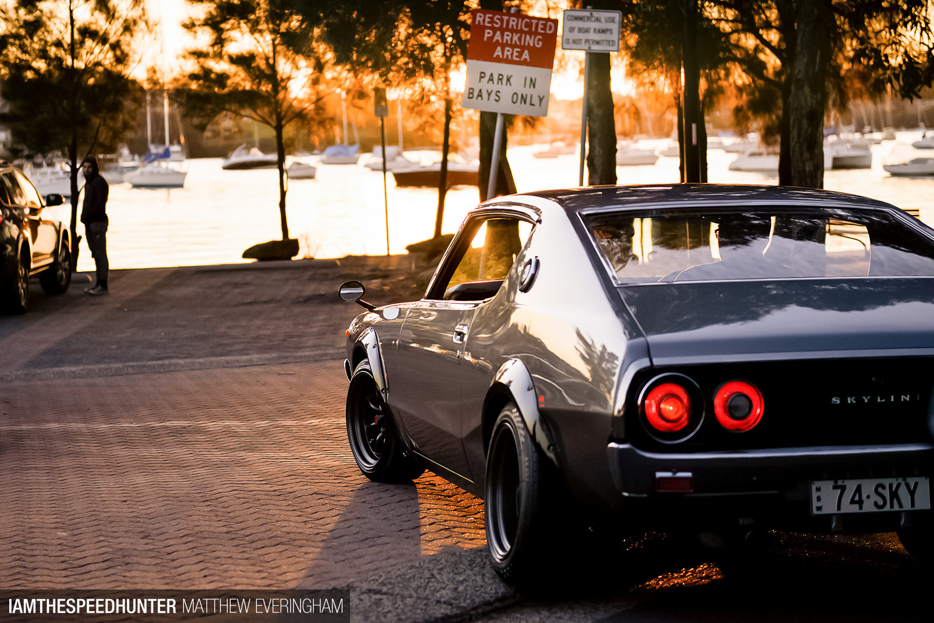 Chuck, one of the Hakosuka owners and also president of the Sydney Datsun Club, recommended a cool little boat ramp area nearby to get some group shots of the cars before the sun dropped behind the horizon. We raced against the sun to get there with some time to spare, but I’d call it a draw. I watched the last blip of sun sink below the horizon as the cars rolled into position.