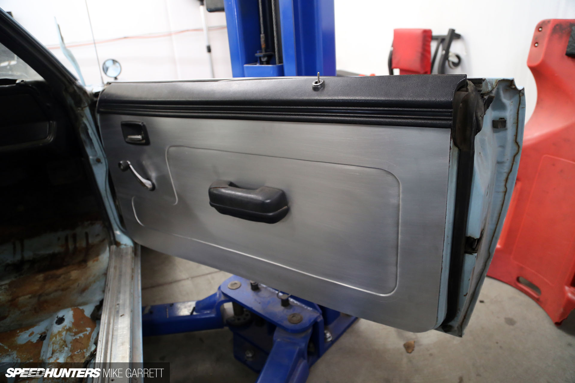 The first things to go were the shredded up door panels. Rather than replacing them with reproduction parts, we’ve gone for aluminum door skins that retain the factory door handles and window cranks.