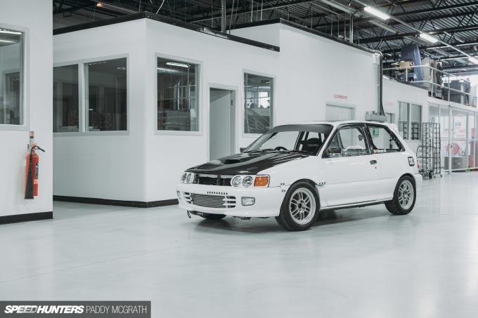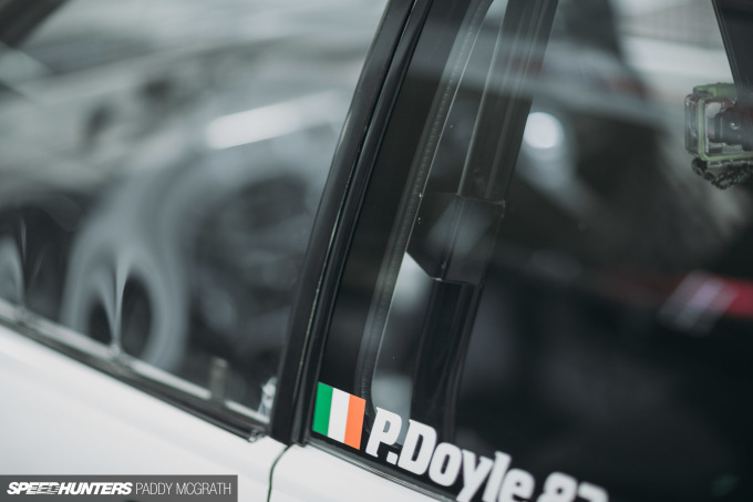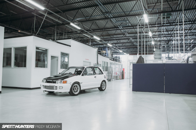 It’s a dull Saturday afternoon and we’re walking through a quiet, clean factory that’s closed up shop for the weekend. “My boss is a petrolhead, too. So he loves this thing and doesn’t mind it being here.” The voice talking to me is that of Pete Doyle, an amateur racer who competes in time attack and sprint events in Ireland. He’s also the owner, builder and driver of the brilliant white EP82 Toyota Starlet that sits in front of us. “It used to be my road car, but it’s slowly become what it is now.”