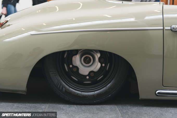 Sitting pretty much on the tiled floor, the Speedster’s low-slung body was towered over by onlookers. In stock form the 356 is already a small car by today’s standards, but with all height taken out of the suspension (and then some) it looks diminutive.
