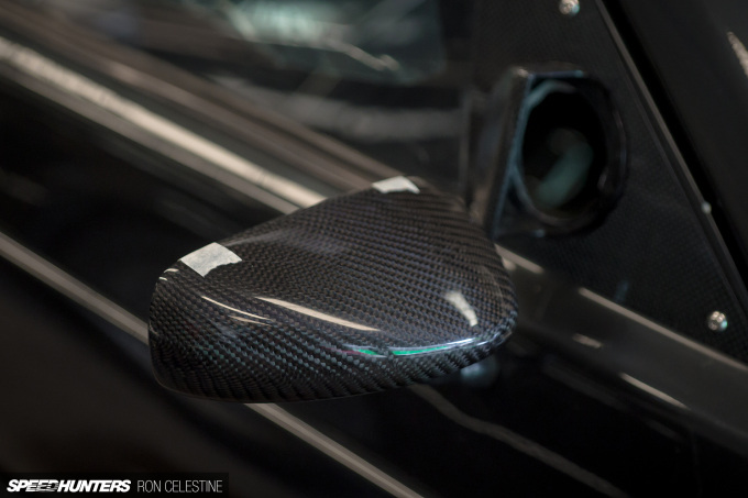 Ensuring the car was light was one of the key build requirements, and to that end the 190E was placed on a serious diet regimen. Everything on the body that could be unbolted was replaced with fiberglass, the only exceptions being the hood and trunk which are carbon fiber pieces. The roof was also replaced with carbon fiber, which aside from its weight-saving properties has lowered the car’s overall center of gravity for improved handling.