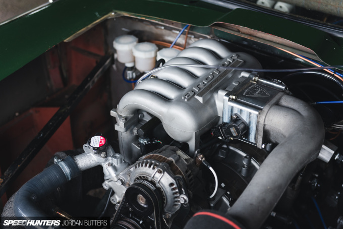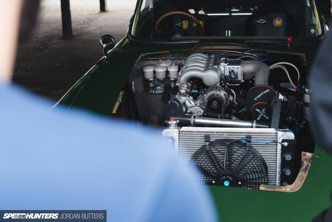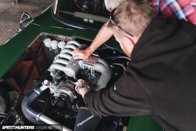 Rather than retain the stock turbochargers, Triple B opted for a high-compression, high-revving naturally aspirated motor. The car arrived at Shelsley Walsh with the engine in place, but not plumbed in. Some 14 hours later, I was fortunate enough to show up just as the team sparked it to life after painstakingly grafting together a custom loom overnight.