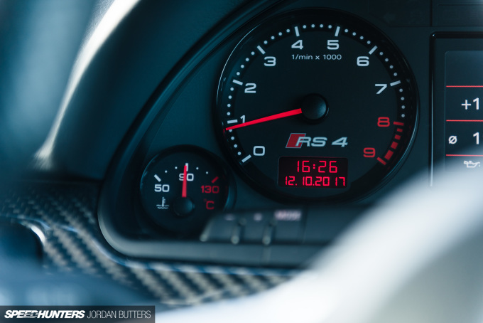 The B7 RS4 is considered by many to be Audi’s best-handling RS model. My car is still running the original DRC (Dynamic Ride Control) suspension, a clever mechanical system which hydraulically links diagonally-opposed shock absorbers via central valves, regulating and controlling oil flow to the shocks which need the most support in corners. Sadly, it’s a system that’s notorious for failure. This car has had two shocks replaced already during its lifetime, so I’m well aware that at some point I’ll need to make the change to coilovers.