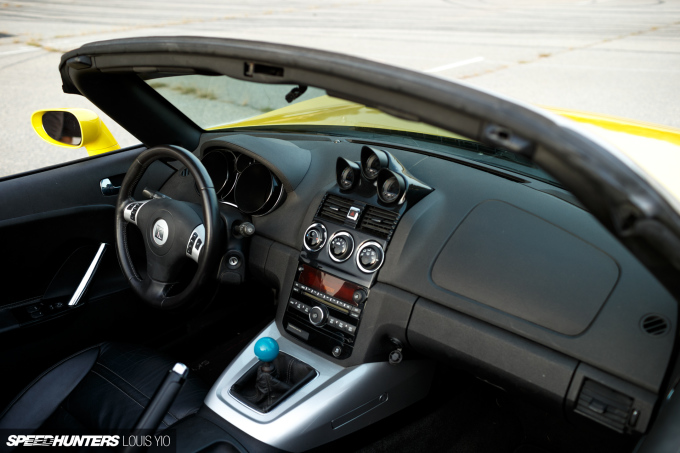The beauty of this car is that it doesn’t stand out, well, other than being a Saturn Sky. At first blush, you probably wouldn’t even look at it funny; then you start to notice the Luma Sport rear flares straight from Germany, fitted because the Forgestar F14 18×10-inch wheels and 275/40R18 Nitto NT555 tires all around poke out in the rear. Then you look between the spokes of the front wheels and see the Wilwood 4-piston calipers with custom floating rotors that get this Sky stopped like lightning.