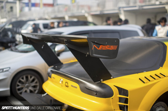 The rear hatch is replaced with a sheet of carbon fiber moulded to mimic the contours of the trunk lid, glass and all. That means there’s no real way to see rearward, other than the Craft Square side mirrors, which are carbon too of course. The single element rear wing is still quite compact if we compare it to other cars that were present on the day like the Friends Racing S15 and the AutoBahn Z30 Soarer. Maybe the team are working towards a more aggressive rear downforce as they dial in the car properly.