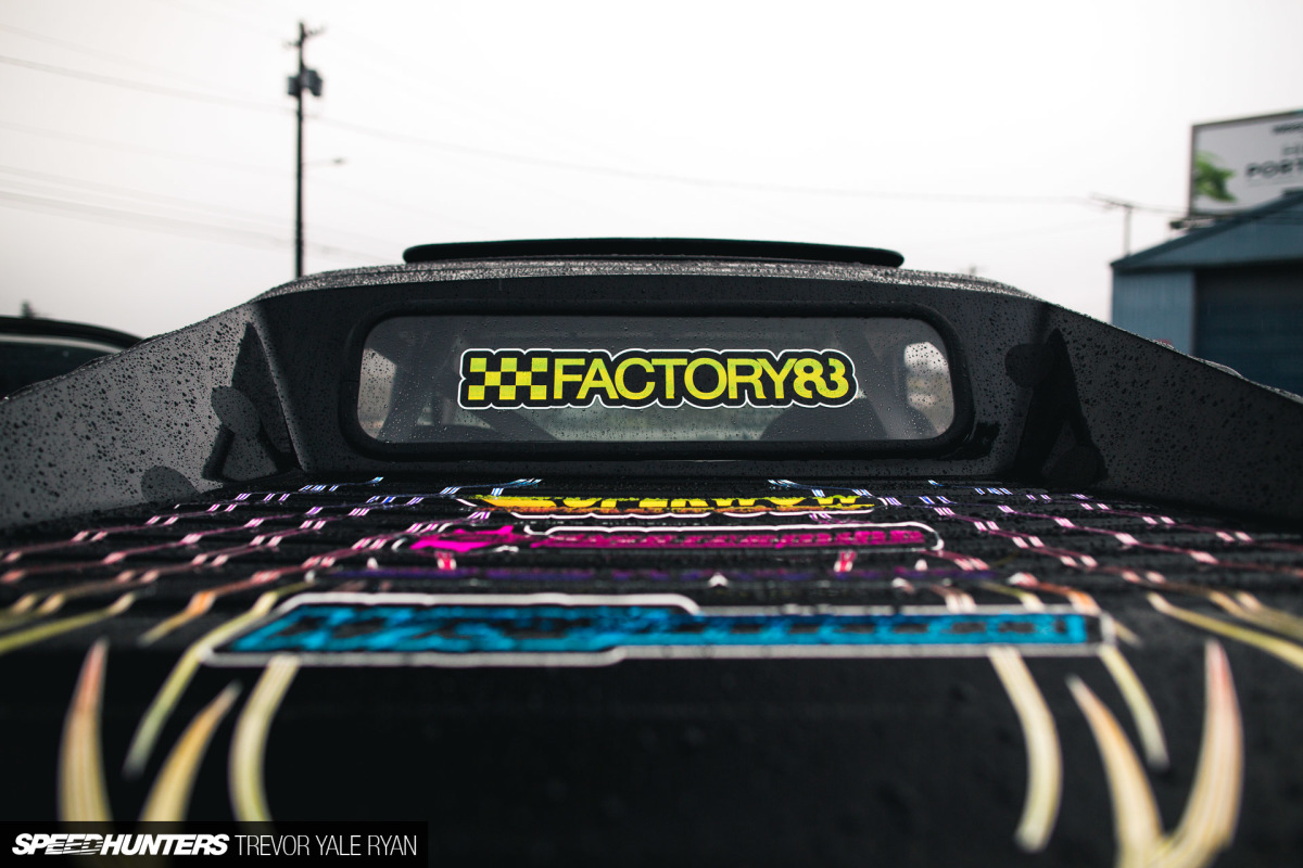 It’s essentially a three dimensional design that continues along the sides, top, and back of the inverted hatch that Evan sourced from Yahoo! Auctions Japan, which was imported from his friends over at Wolfreign Motors. It’s worth mentioning that the cover saves over 50lb (23kg) by avoiding the use of the heavy factory glass.